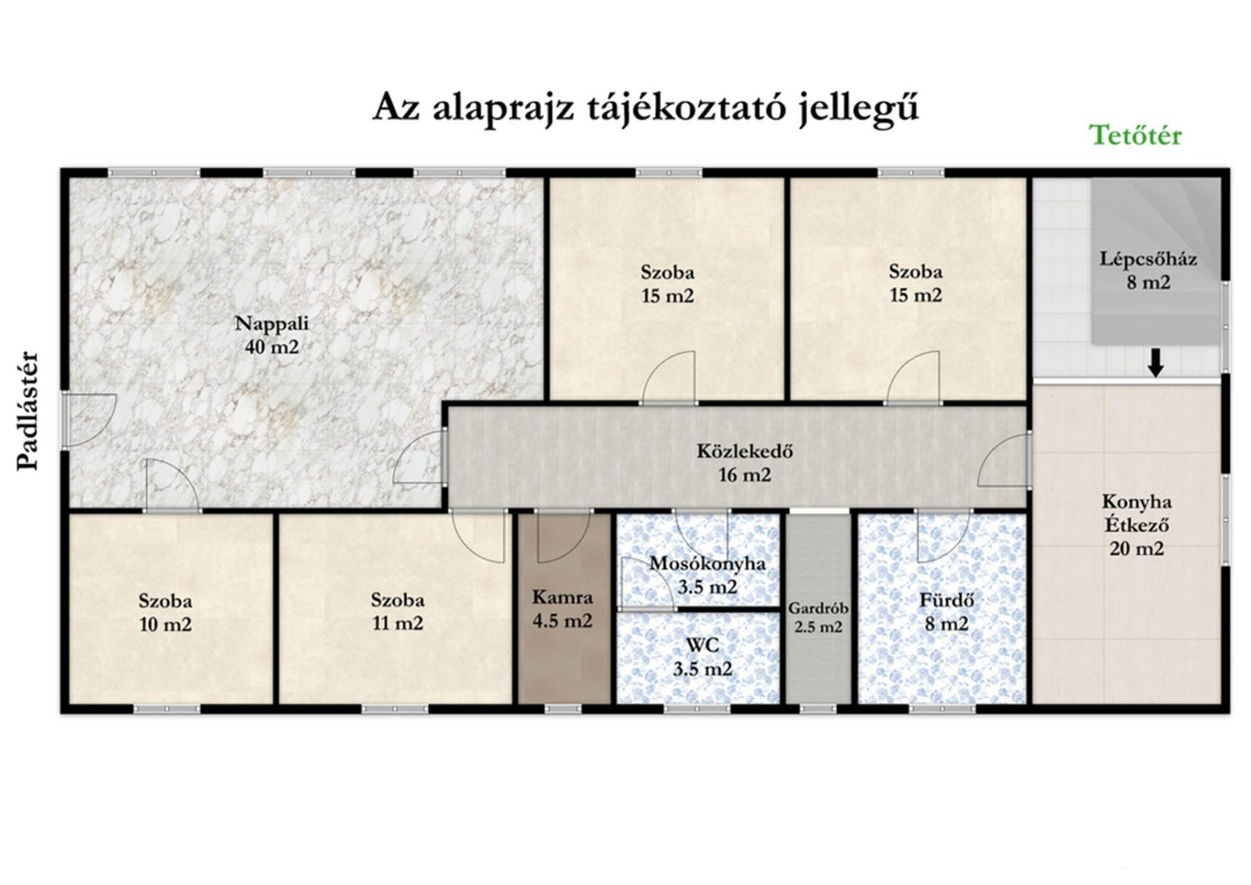 Az emeleten elhelyezkedő, teljesen külön bejárattal rendelkező, 157 négyzetméteres lakótér a földszintről közelíthető meg, de funkcionálisan teljesen elkülönül az üzemi résztől. A bejáratnál egy hangulatos, kandallóval ellátott előtér fogad, wc-vel és külön zuhanyzóval, ahonnan lépcső vezet az emeleti lakótérbe. A felső szinten egy tágas konyha-étkező, egy közel 40 négyzetméteres nappali, négy hálószoba, gardrób, kamra, mosókonyha, külön WC, valamint egy sarokkádas és zuhanyzós fürdőszoba került kialakításra.