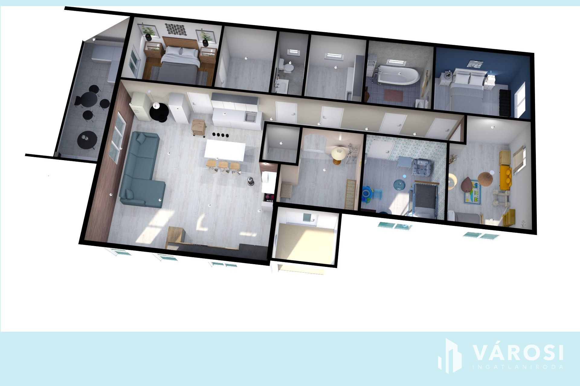 - 125 m2 alapterületen, tágas előszoba, közlekedő, AMERIKAI KONYHÁS NAPPALI, kamra, + 4 HÁLÓSZOBA, Gardrób,