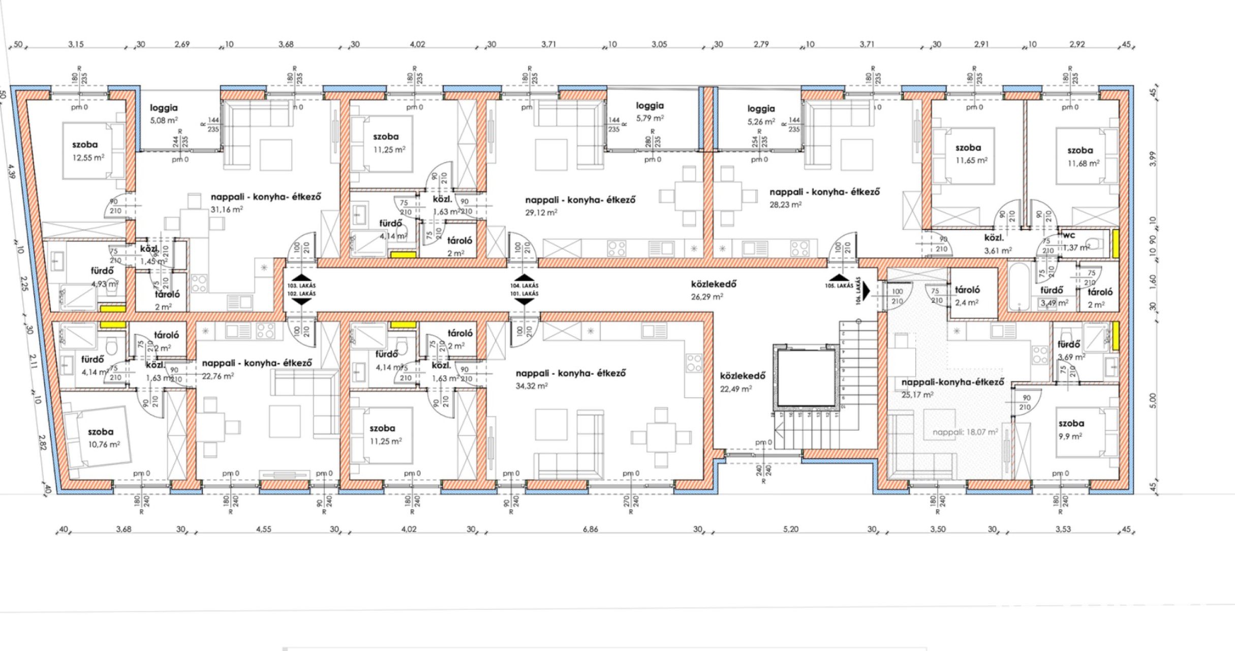 Makón, presztizs lokációval rendelkező - Makói fürdőtől 60 méterre, a Napfény Residenceben - a Páva utcában , Eladó egy most induló, tégla építésű, ELSŐ EMELETI , 53,93 nm-es élettérrel rendelkező, amerikai konyha nappali plusz egy szobás, loggiás lakás (104.lakás).